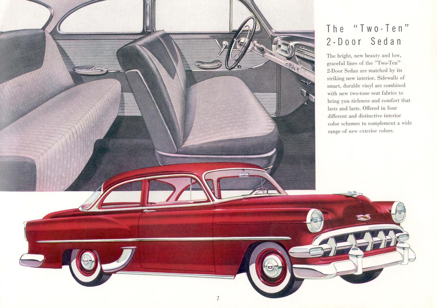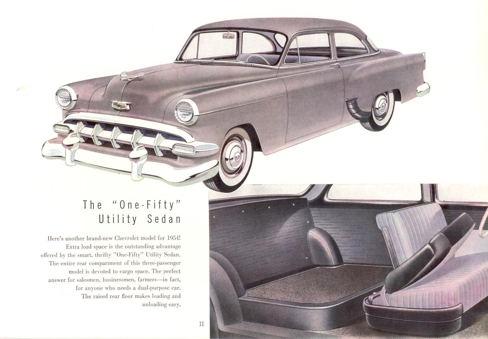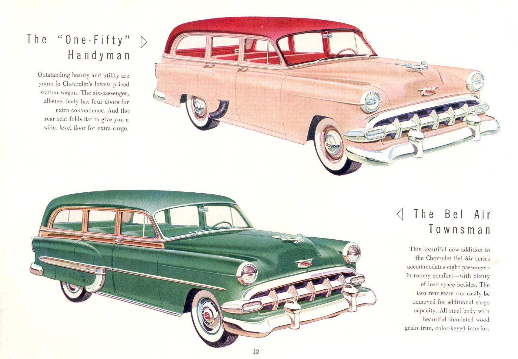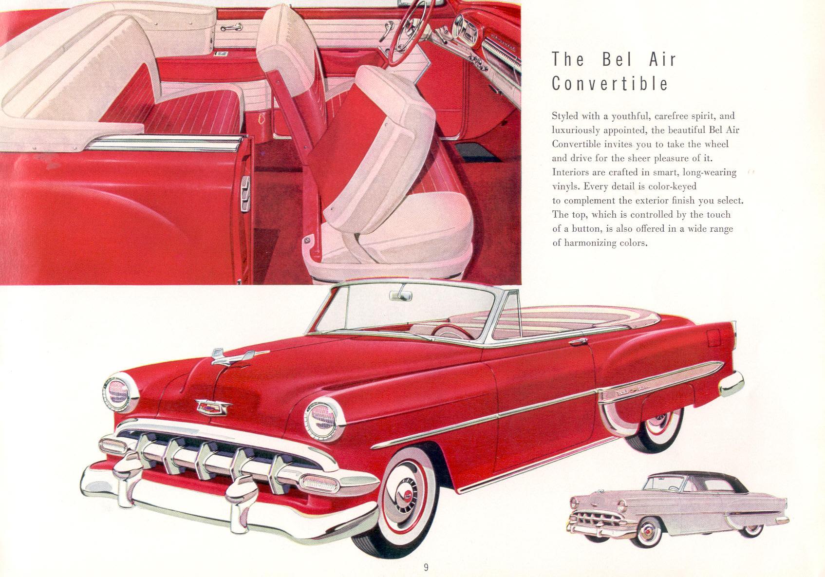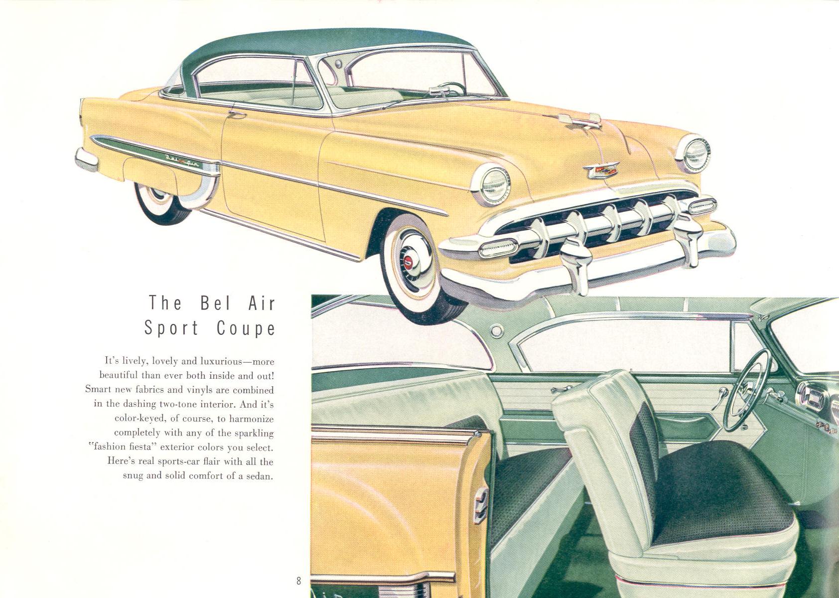 Models and Body Styles for the 1954 ChevroletsThe 1954 Chevrolets are very similar to the 1953 year. Basically, the only difference is a bit more powerful engine, front grill change, the hood bird is different, the Chevrolet hood and trunk plaques are different, and the 1954 radio has a Chevy logo on the dial. If you know of any other differences, please let us know! This car also came in 3 styles. The higher end "Bel-Air" Series, the mid range "210 Series", and the economy range "150 Series". The following pictures are from the catalog (if your on a low resolution screen, wait for the picture to load and expand the size by clicking on the red box in the lower right hand corner of the picture):