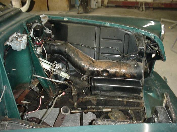 Notice rust and corrosion. Original paint color on firewall. |